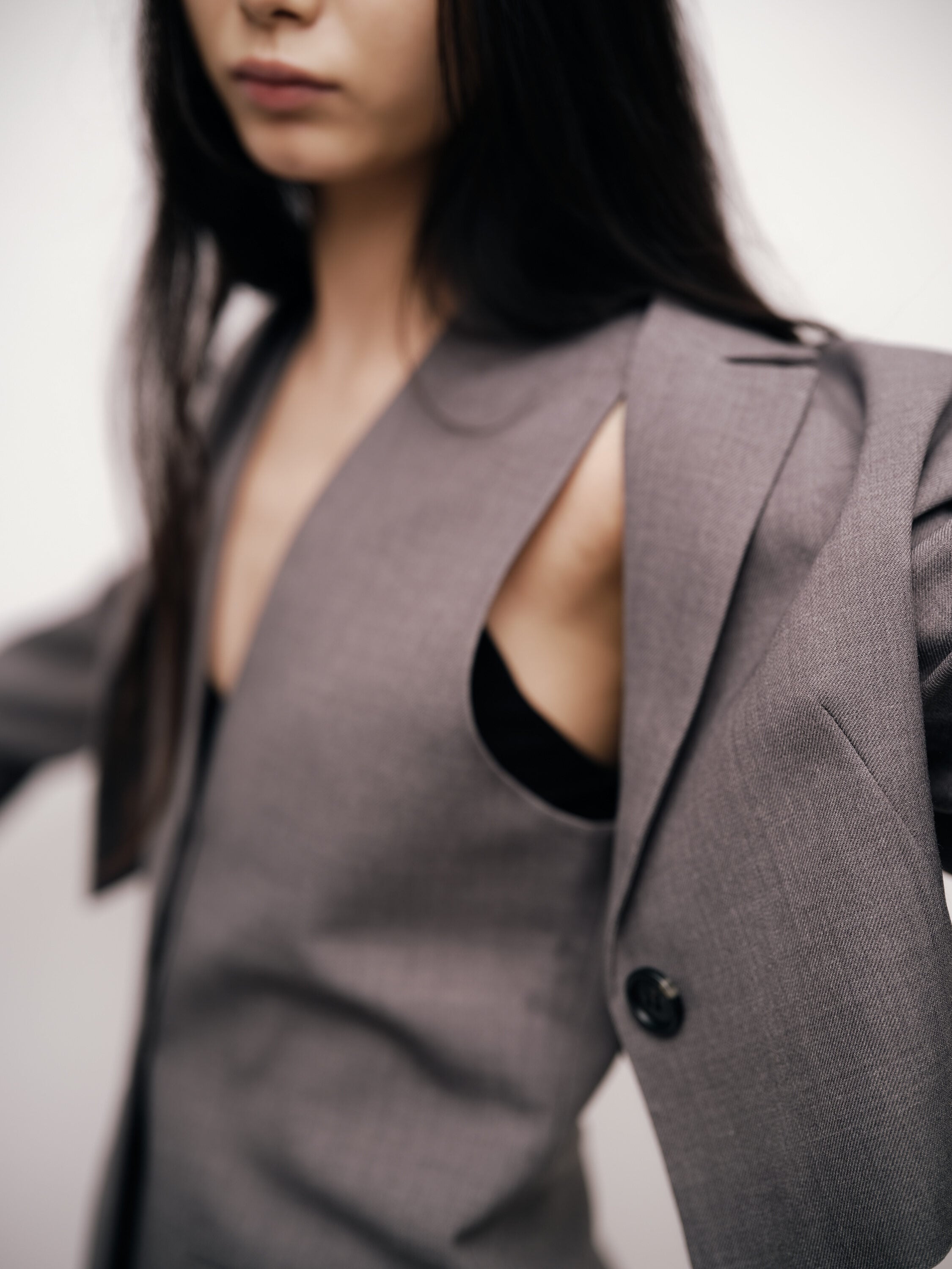 同シリーズのベストとパンツとあわせて3点セットで着こなすと、一体感のあるスタイルが完成し、凛とした大人のカッコよさを演出します。