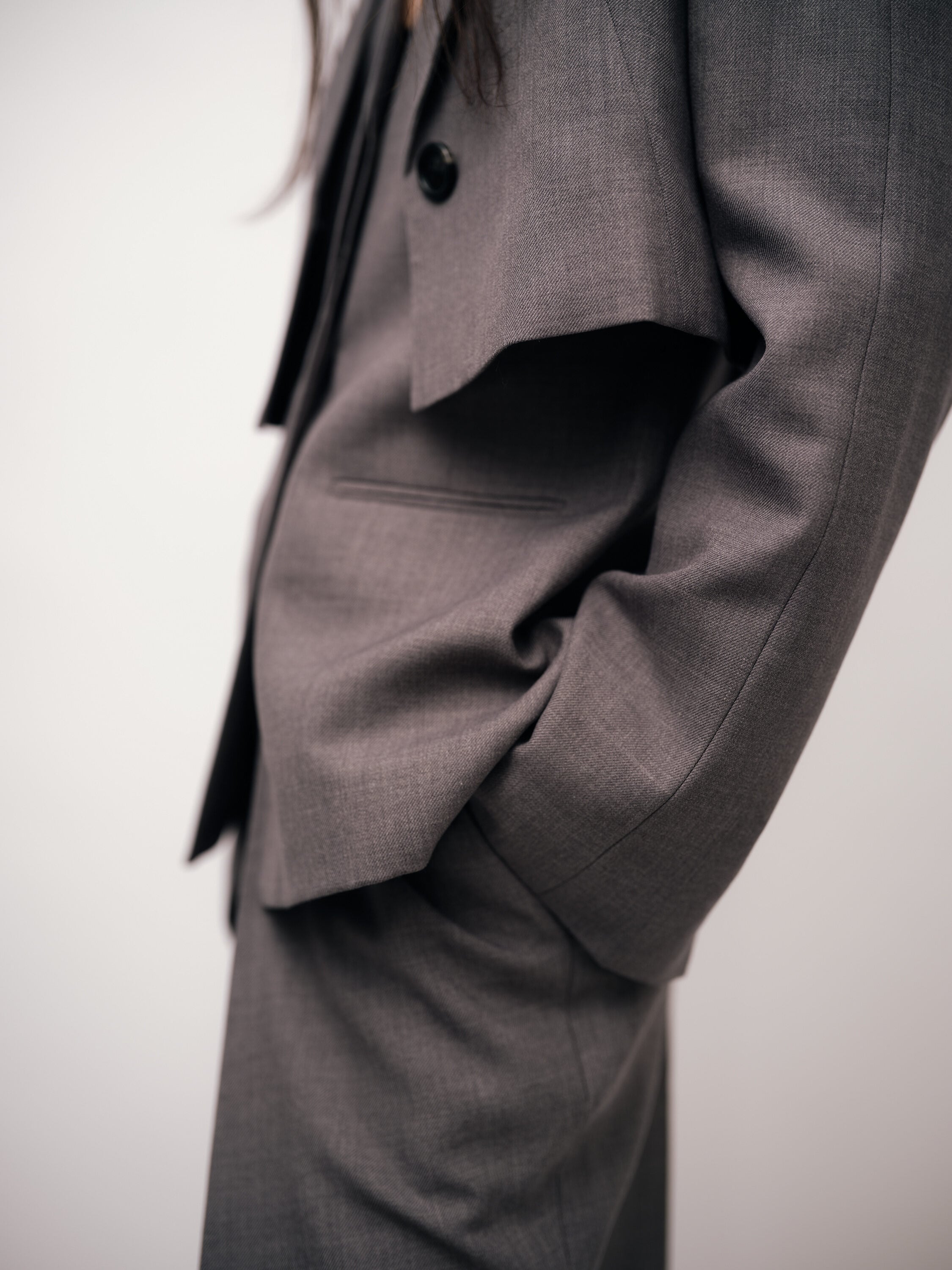 さらに、ノンミュールジングウールは、羊に苦痛を伴う処置を行わずに採取されたウールを原料としており、動物愛護の観点からも高く評価されています。品質や安全性にも優れ、日本で丁寧に織り上げられた生地は、適度な厚みとしっかりとした質感があり、羽織るだけで高級感のある佇まいに。仕立て映えする生地は、美しいフォルムをキープしながら着る人のスタイルを引き立てます。