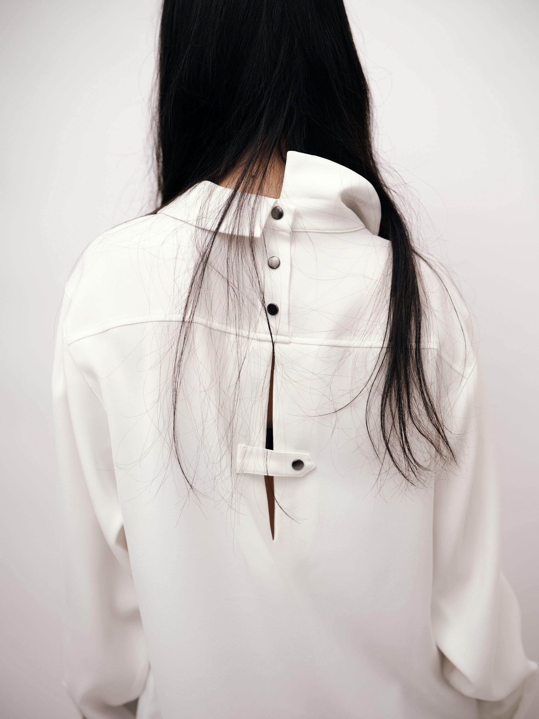 また、背中部分にはアクセントとしてボタンディテールをデザイン。ボタンを開けて着用することで、抜け感のある印象に変化し、気分やシーンに合わせて着こなしを楽しめます。